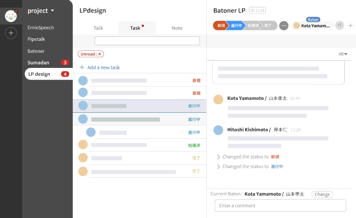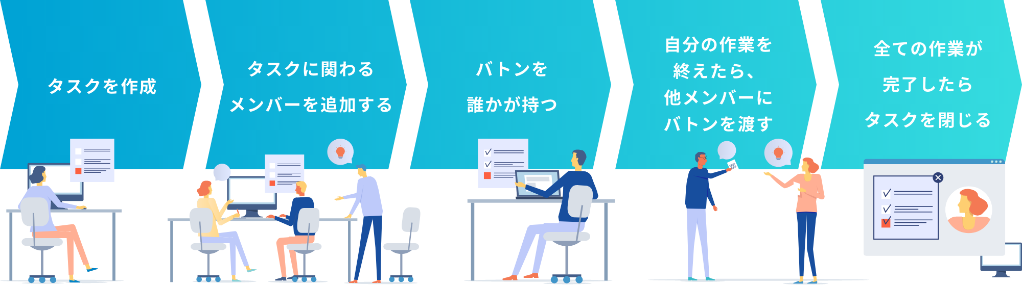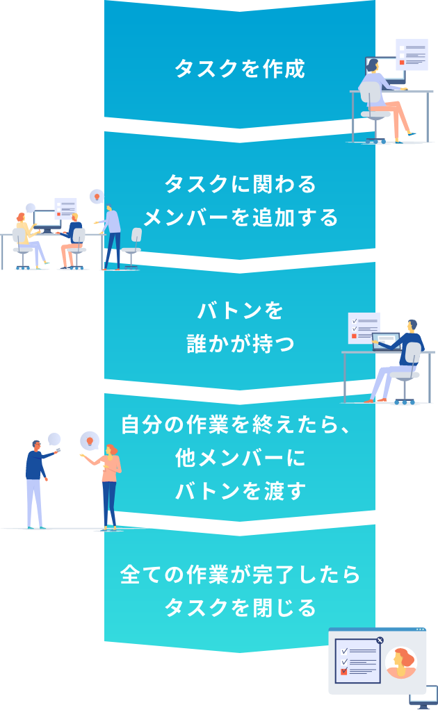 タスクは1人で終えられるものより複数名が関わるものが多い。そんな状況を踏まえ、Batonerに設けられている機能が「バトン」です。プロジェクト内における細かなタスク毎にスモールチームを形成し、バトンを渡しあいながらタスクを完了させていきます。今現在、誰がそのタスクを担っているのか。進捗状況が明確化されるため、プロジェクトがスムーズに進行できます。